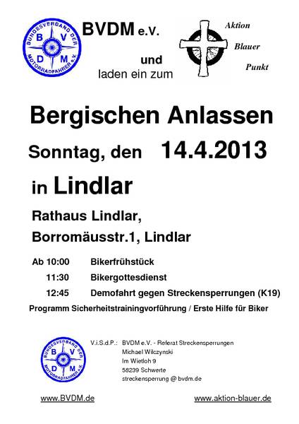 Es geht dabei auch um eine Demo-Fahrt des BVDM gegen eine Streckensperrung der K19 zwischen Lindlar und Marienheide.