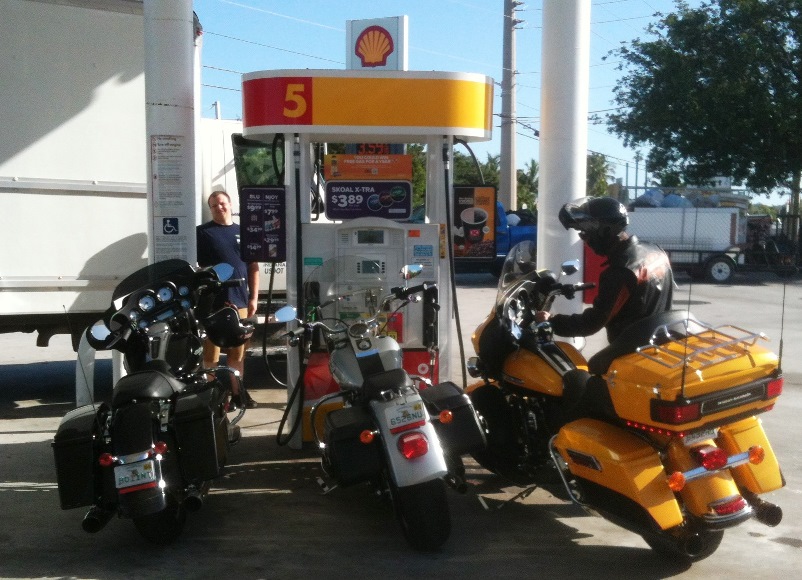 Ganz ehrlich, ich kann es Dir nicht sagen. Wir haben immer in der gleichen Kombination getankt. Drei Motorräder werden sternförmig an der Tanke platziert, aufgefüllt und die Zeche wird abwechselnd gezahlt. In der Regel waren das zwischen 40 und 50 Dollar. Bis Key West sind es mehr als 40 Brücken und es gab mindestens einen Satz gegrillte Arschbacken, so hat die Maschine von unten geheizt... -