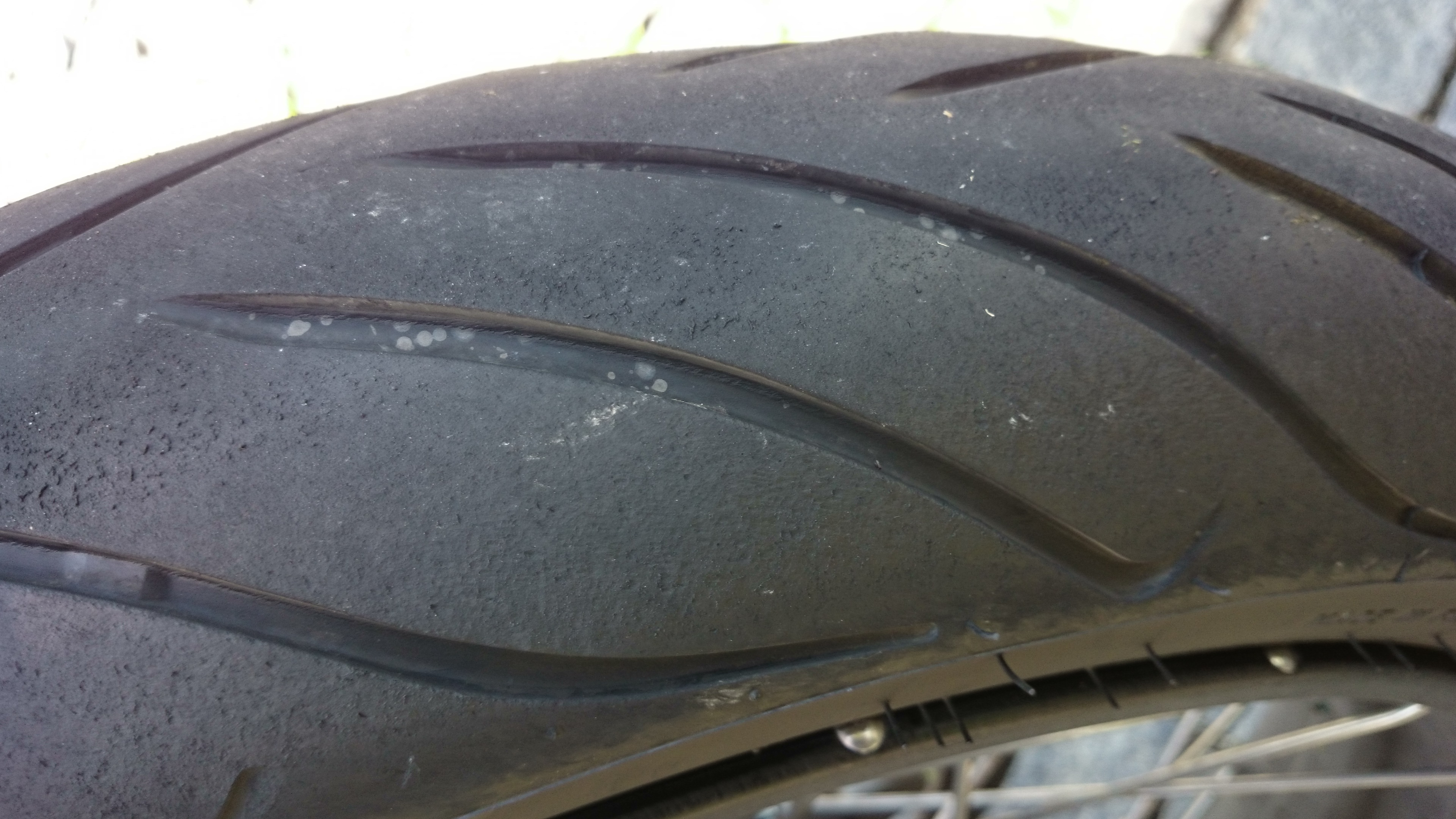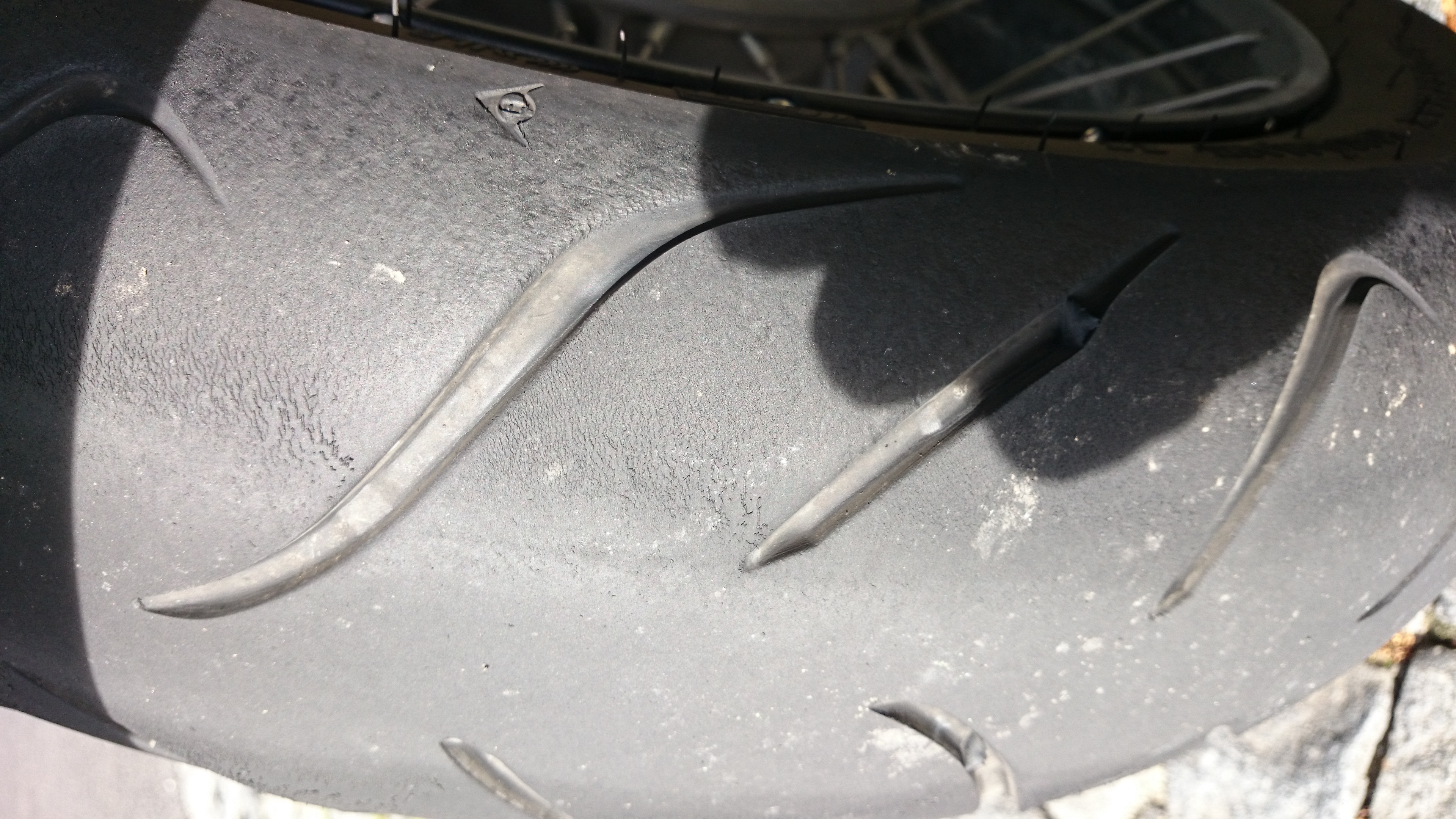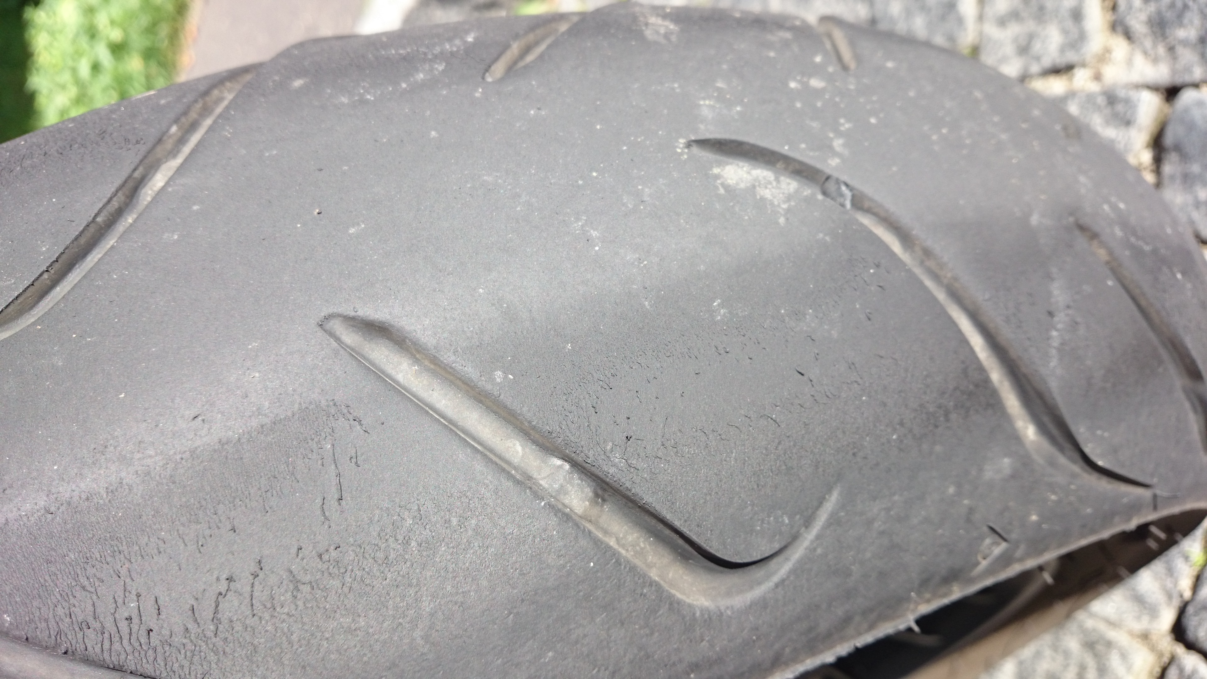 Da sieht man, dass Du den Reifen ordentlich ran nimmst - oder er ist doch ein bissl weicher, so wie er schmiert. Ich hatte mal einen Slick auf einer Superbike-Maschine nach dem Rennen gesehen - da konnte ich es mir erklären, aber bei dem hier ???