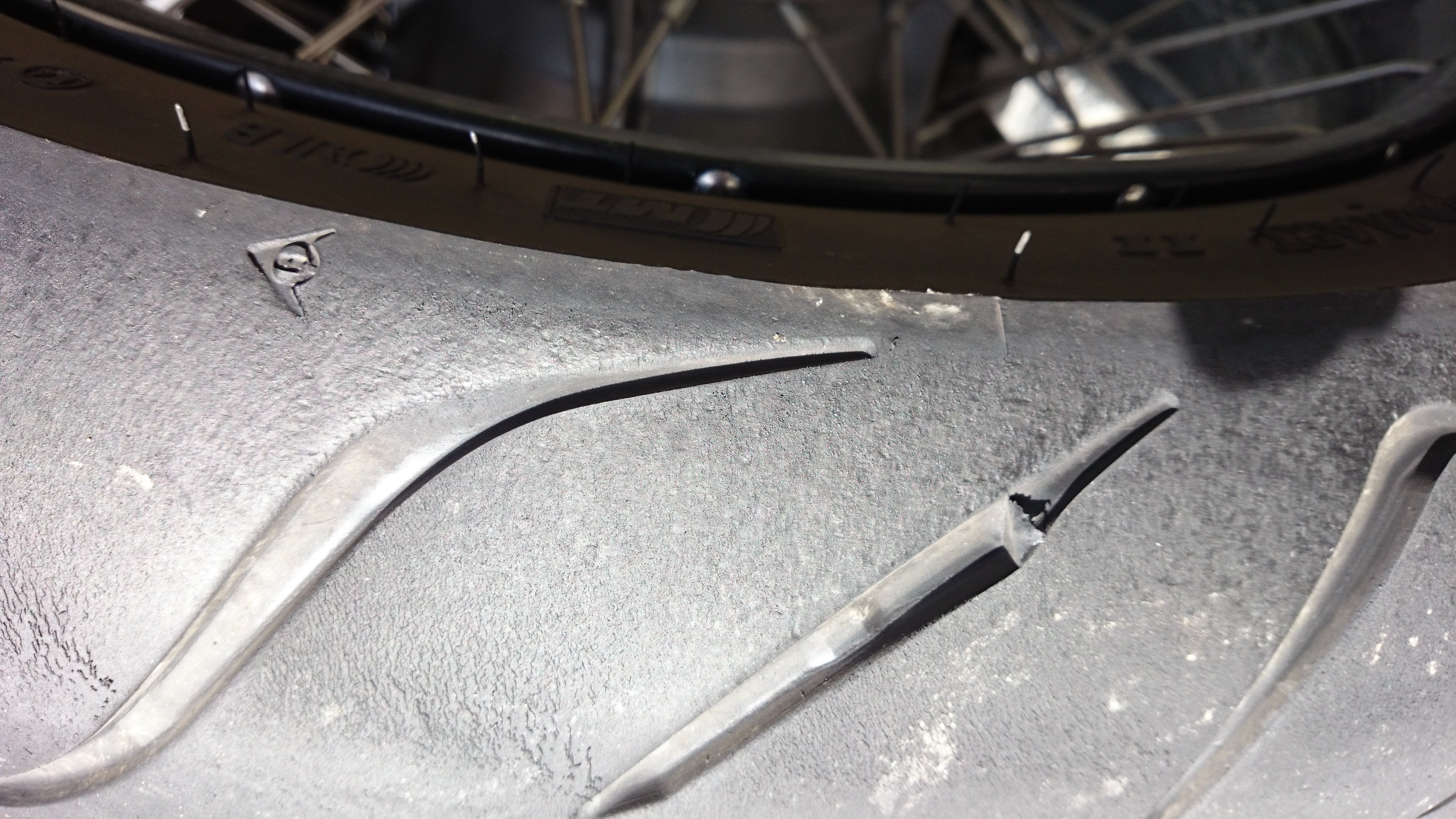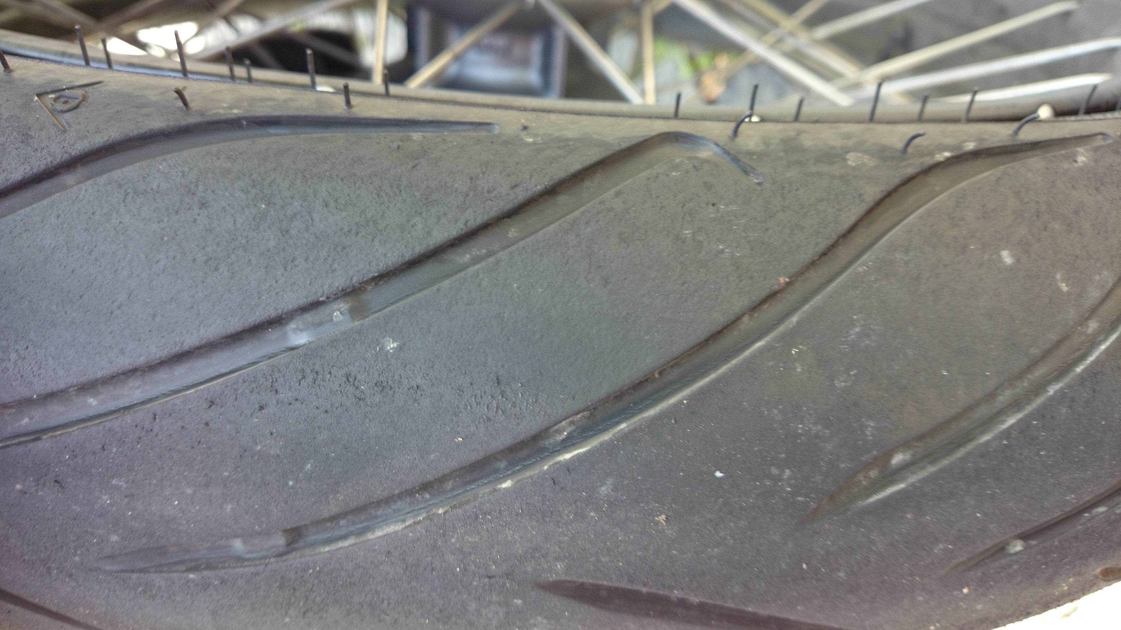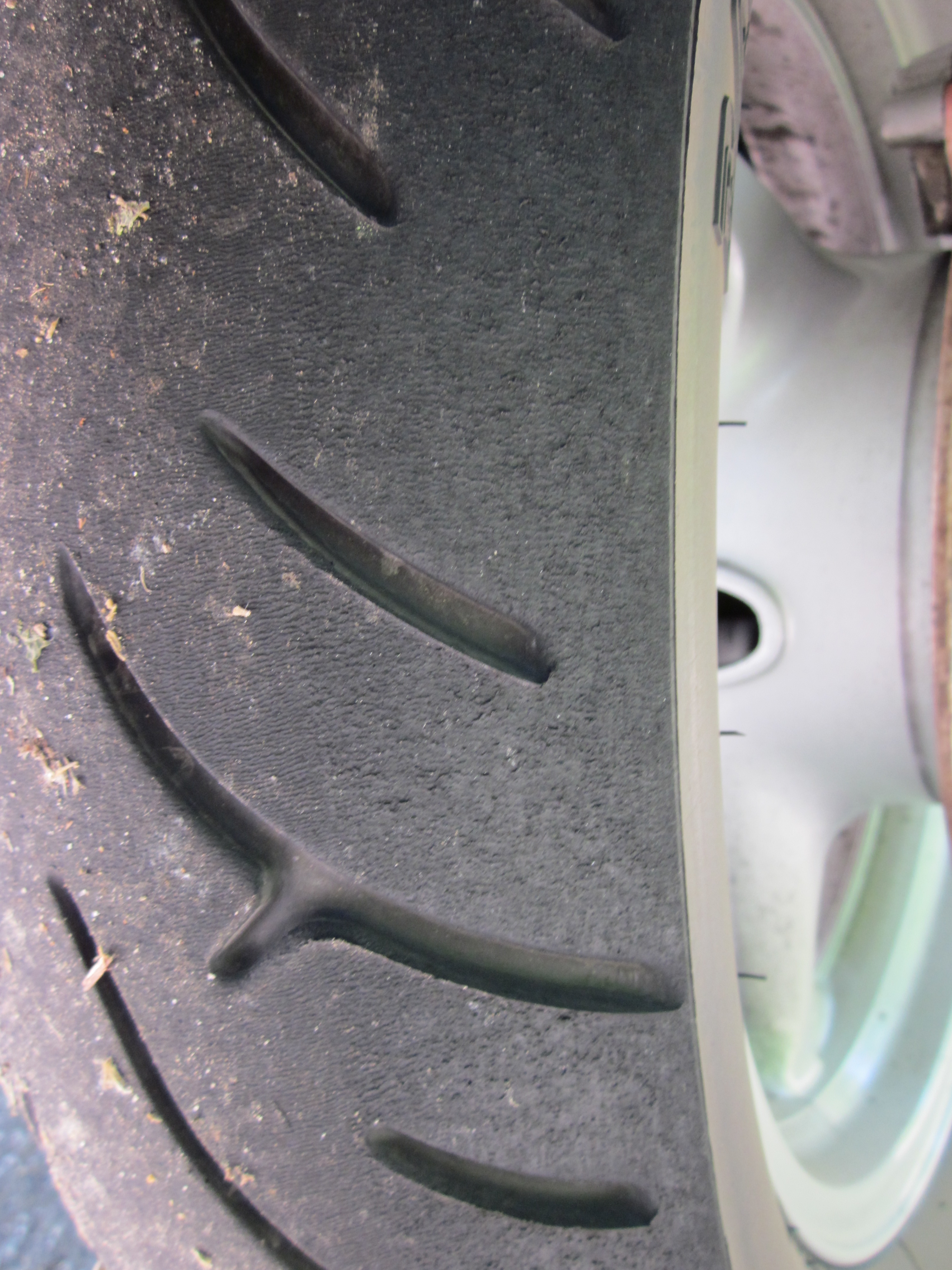 Da sieht man, dass Du den Reifen ordentlich ran nimmst - oder er ist doch ein bissl weicher, so wie er schmiert. Ich hatte mal einen Slick auf einer Superbike-Maschine nach dem Rennen gesehen - da konnte ich es mir erklären, aber bei dem hier ???