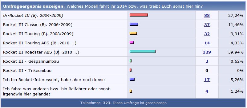 Die Resonanz darauf, sprich die Anzahl der Forenmitglieder, die an der jeweiligen Umfrage teilgenommen haben, läßt sich durchschnittlich mit 73 beziffern. Vergleicht man die Anzahl der Teilnehmer an Umfragen mit der Anzahl aller gemeldeten Forenmitglieder (aktuell 1232) dann sind das ca. 6% aktive Mitglieder im Forum.