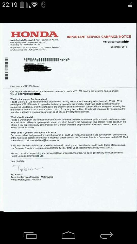 Eine Rueckrufaktion der VFR1200X bekannt ist. Wenn dann werden wir alle übers KBA informiert.