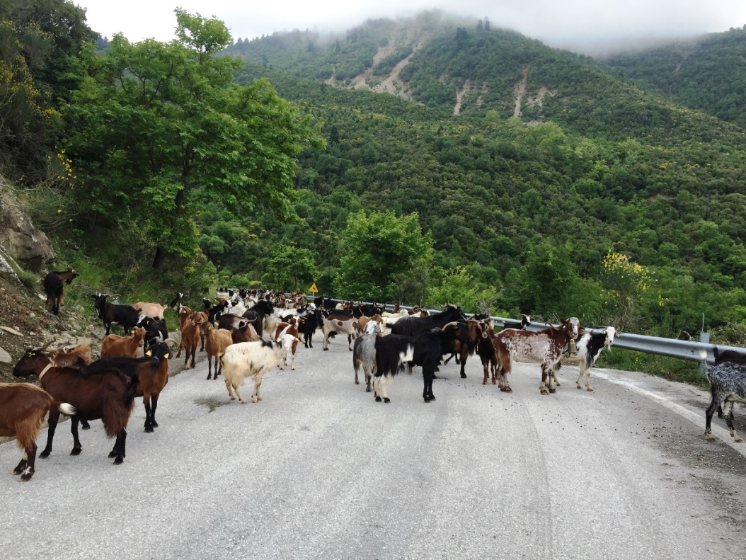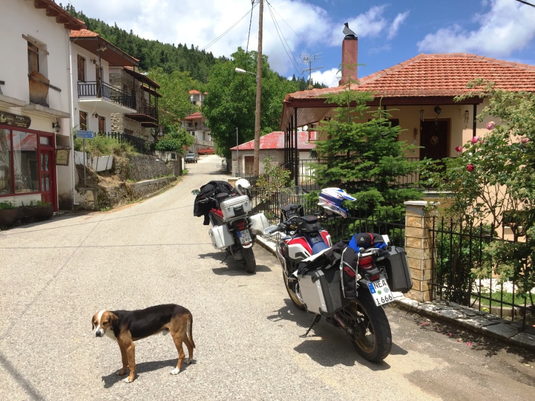 Frisch gestärkt ging es am anderen Morgen auf in die griechichen Berge. Am ersten Tag in Griechenland waren kleine Straßen auf dem Programm. Schnell war die Stadt verlassen und außer uns und ein paar Ziegen war keiner mehr in den Bergen gesehen. Hin und wieder ein paar kleine Dörfer, wo die Kinder uns nach schauten. Sonst nur Kurven und herrliche Landschaften. Mittag haben wir drei dann in einem kleinen Dorf in einer Bar Rast gemacht. Verpflegt haben wir uns in einem liebevoll eingerichteten Laden einer netten Frau.