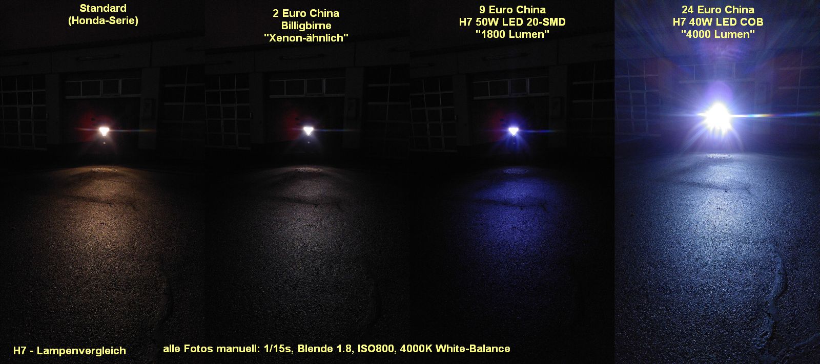 Ich habe letzten Sommer etwas Elektronikzubehör in China bestellen müssen und habe mir dann mal drei H7-Leuchtmittel mitbestellt, da ich selbst mal live die Unterschiede sehen wollte. Nun habe ich letztens mal die frühe Dunkelheit Abends genutzt und einen kurzen Vergleich gemacht zwischen vier Varianten. Ich habe dabei nur den H7-Abblendlicht-Scheinwerfer meines 2014er Crosstourers getestet.