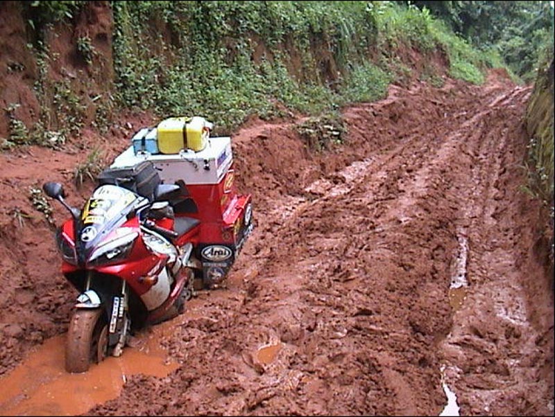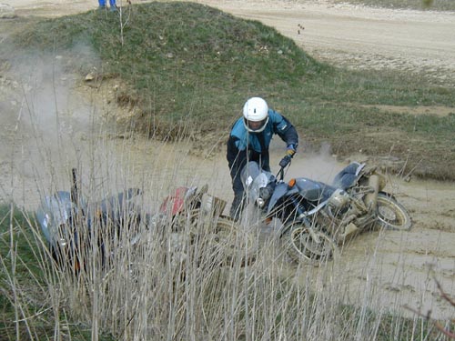 :o Wie bekommt man eine Maschine nur wieder aus einem solchen Morast heraus? Ohje, wenn man da alleine ist... Ich habe es noch nie probiert, aber ich weiß gar nicht, ob ich das Hinterteil meiner Maschine überhaupt anheben könnte. Ich glaube kaum. Da liegen gute 100kg auf einem Reifen und dann die ungünstigen Hebelverhältnisse... :think: