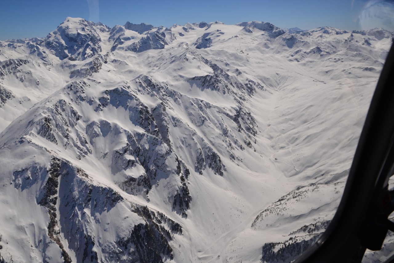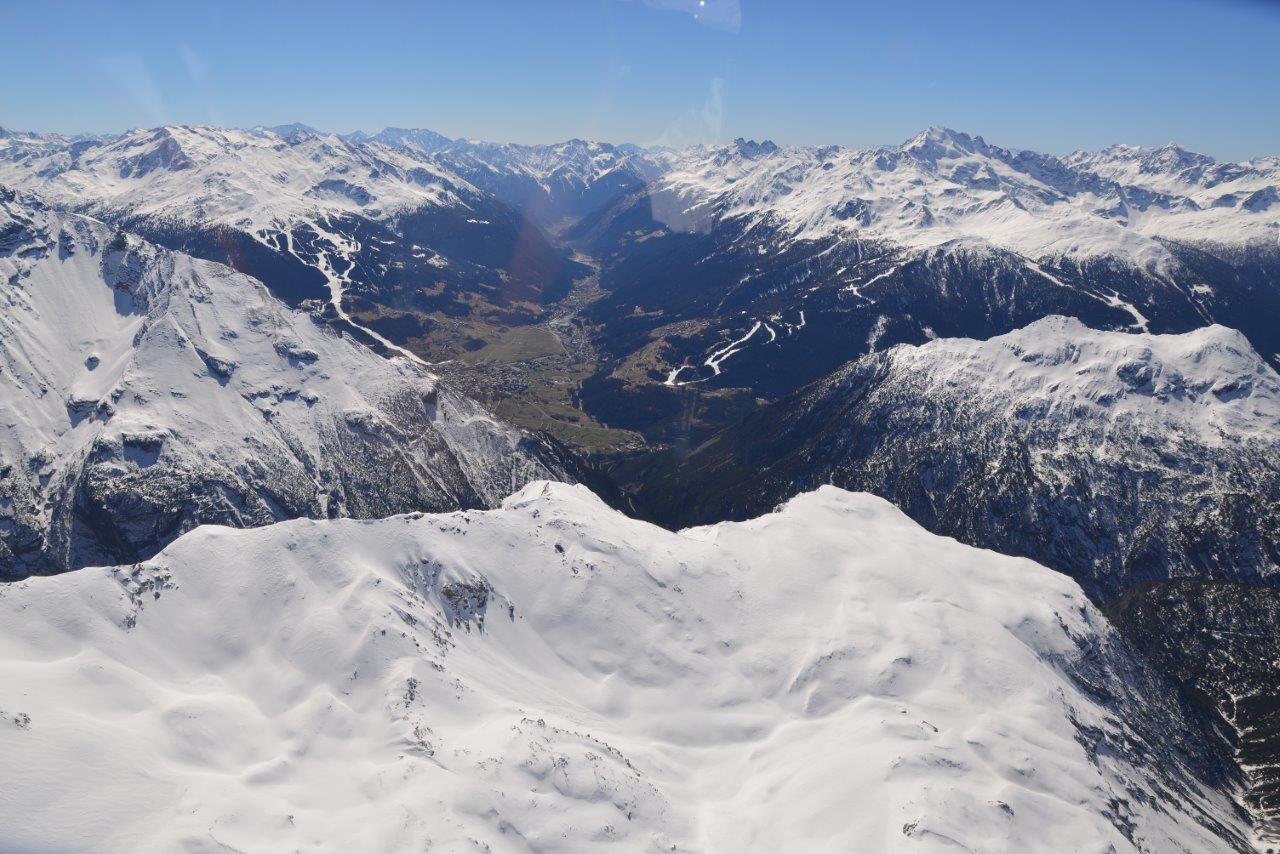 Man kann die Serpentinen im Tal (rechts im Bild) gut erkennen.