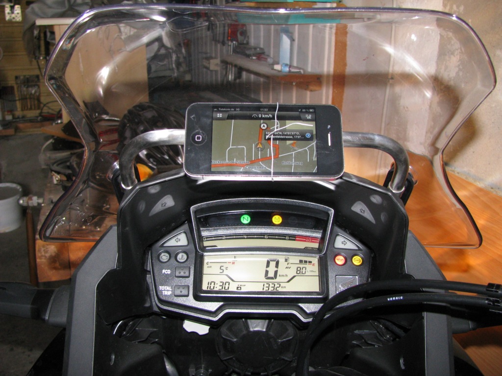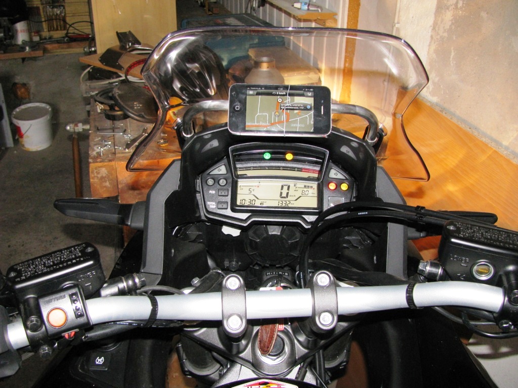 3.Wäre mir etwas zu knapp überm Drehzahlmesser..... der Bügel ist natürlich auf mein Smartphone abgestimmt, wenn man ein großes Navi anbaut, muss er länger sein und die Platte im Winkel angepasst werden. Man kann die Platte auch weglassen und sich die Halterung direkt an das Rohr schrauben.