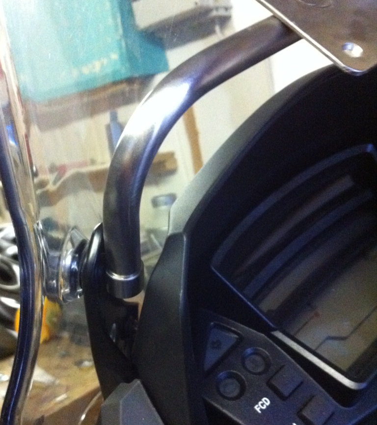Ein Kumpel hat mir aus Edelstahl 2 Proppen gedreht und Gewinde reingeschnitten. Diese werden einfach mit an die Schraube der Scheibe befestigt. Darauf haben wir ein Edelstahlrohr gebogen und eine Halteplatte geschweißt. Auf diese Platte wird dann das Navi, oder in meinem Fall das Smartphone montiert. :idea: