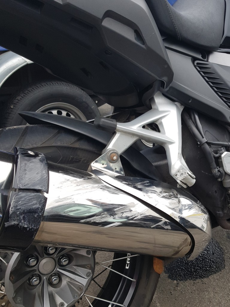 Wollte mal einen Bericht zu meinem Mmoto Sturzbügel schreiben. Nachdem mich am 21.03.19 ein PKW von rechts in die Seite gefahren ist. Zum Glück konnte ich meinen Fuß irgendwie retten. Er hat mich an einer Kreuzung in der Stadt erwischt. Ich wollte bei Grün über die Ampel, hatte gesehen das er falsch in die Einbandstraße gefahren ist. Nachdem er gewendet hatte stand er und ist, als ich vor ihm war losgefahren. Sein Navi hatte gesagt er solle "rechts Abbiegen", war nur eine Straße zu früh. Nehme mal an er und seine Begleitung haben beide nach links geschaut und als sie die richtige Straße (50 m entfernt) gesehen haben einfach darauf los. Nur dumm, dass ich da genau vor ihm vorbeigefahren bin. Sehe das sein Licht immer dichter kommen und kann nur noch Gas geben und so ist er im hinteren Motorrad eingeschlagen. Fußraste und Halterung total verzogen. Ich noch versucht das schlingernde Motorrad irgendwie zu kontrollieren, aber keine Erfolg. Rechts, linke und dann auf der rechten Seite umgefallen. Mit Kopf und rechter Schulter auf den Asphalt geknallt und zirka 10–15 m gerutscht.