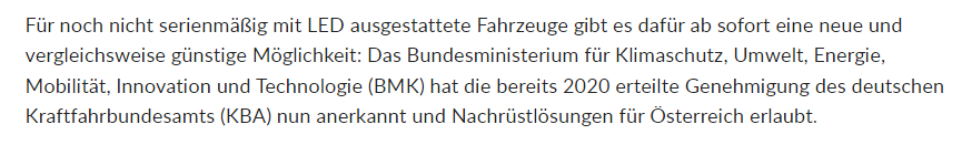 "Für noch nicht serienmäßig mit LED ausgestattete Fahrzeuge gibt es dafür ab sofort eine neue und vergleichsweise günstige Möglichkeit: Das Bundesministerium für Klimaschutz, Umwelt, Energie, Mobilität, Innovation und Technologie (BMK) hat die bereits 2020 erteilte Genehmigung des deutschen Kraftfahrbundesamts (KBA) nun anerkannt und Nachrüstlösungen für Österreich erlaubt."