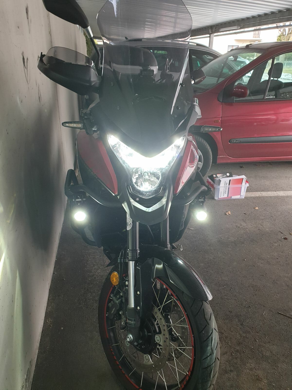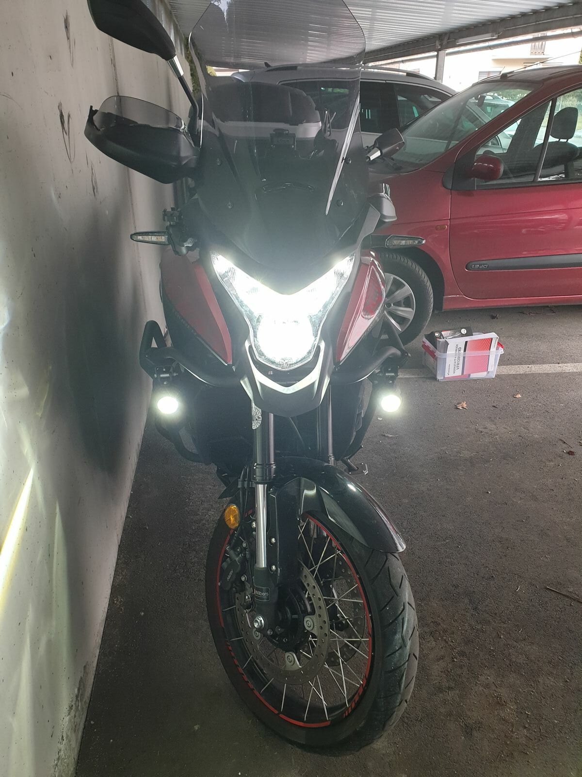 Mein Versuchsaufbau war, den Crosstourer auf dem Hauptständer immer dieselbe Wand aus denselben Entfernungen (10 m bis 15 m) bei Dunkelheit anstrahlen zu lassen. Meine Ziele waren die Vergleiche der Helligkeit sowie der Form des Lichtkegels. Ich habe damals neben den herkömmlichen H7 der Originalausstattung die OSRAM Nightbreaker LED und ein unbekanntes Chinaprodukt verglichen.