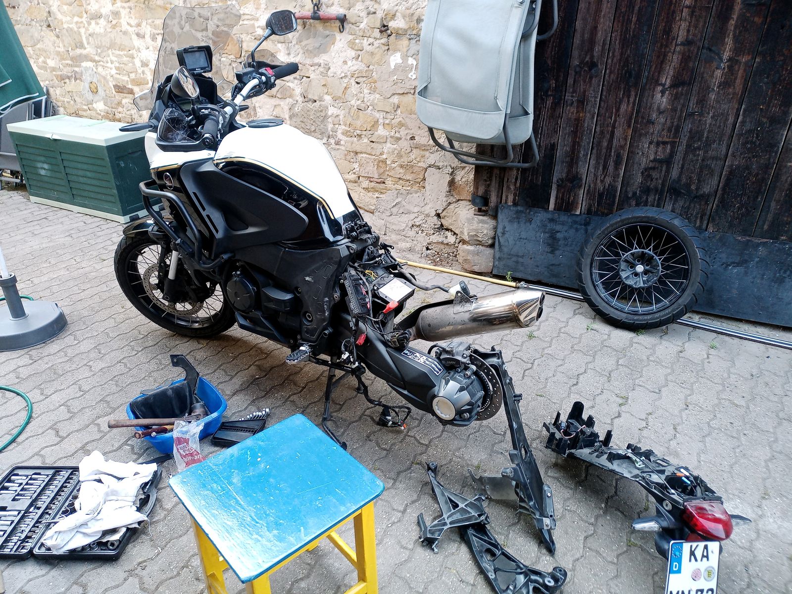 Urlaubsvorbereitung für die Franz.Alpen, Moped steht aufgebockt im Hof.....beim befestigen des Topcases kippt die ganze Kiste ganz sachte vom Hauptständer nach Links und das nur weil der Untergrund uneben war ![]()