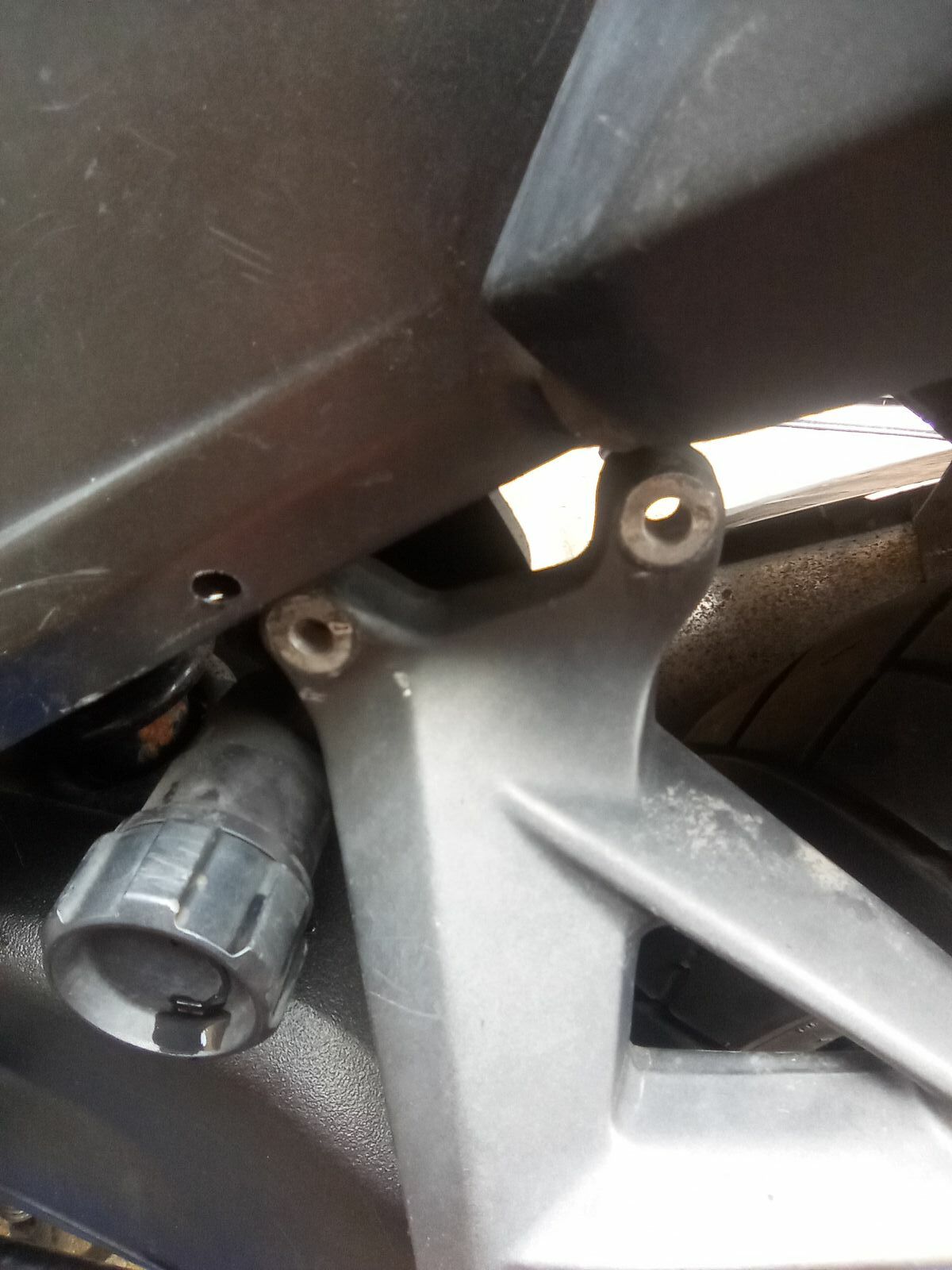 ....beim nächste Stop dann der Schreck: Fußrastenträger hängt nur noch an der hinteren Schraube