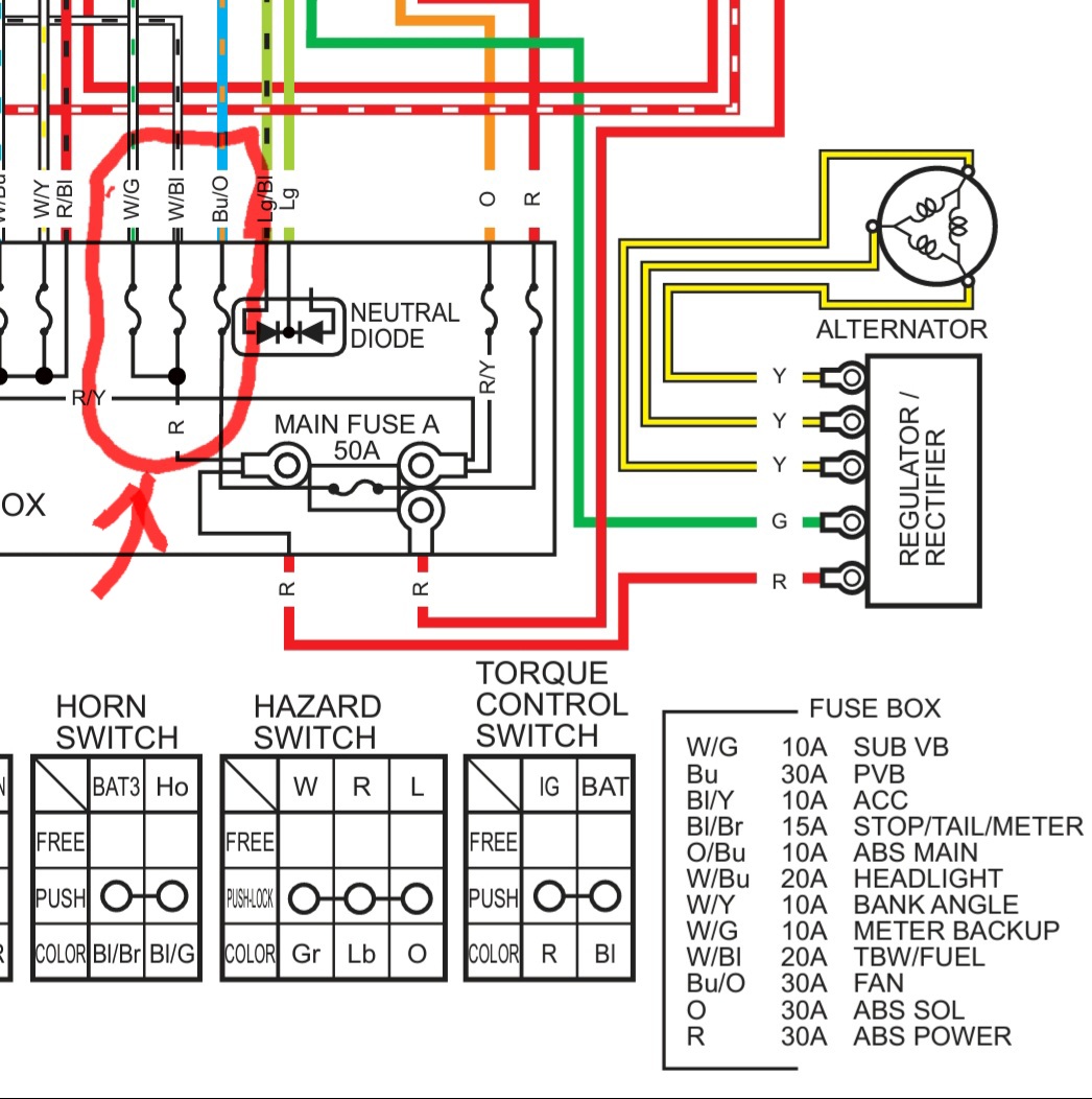Alles anzeigenDie 50A-Hauptsicherung befindet sich zwischen dem Lichtmaschinenregler und der Batterie.