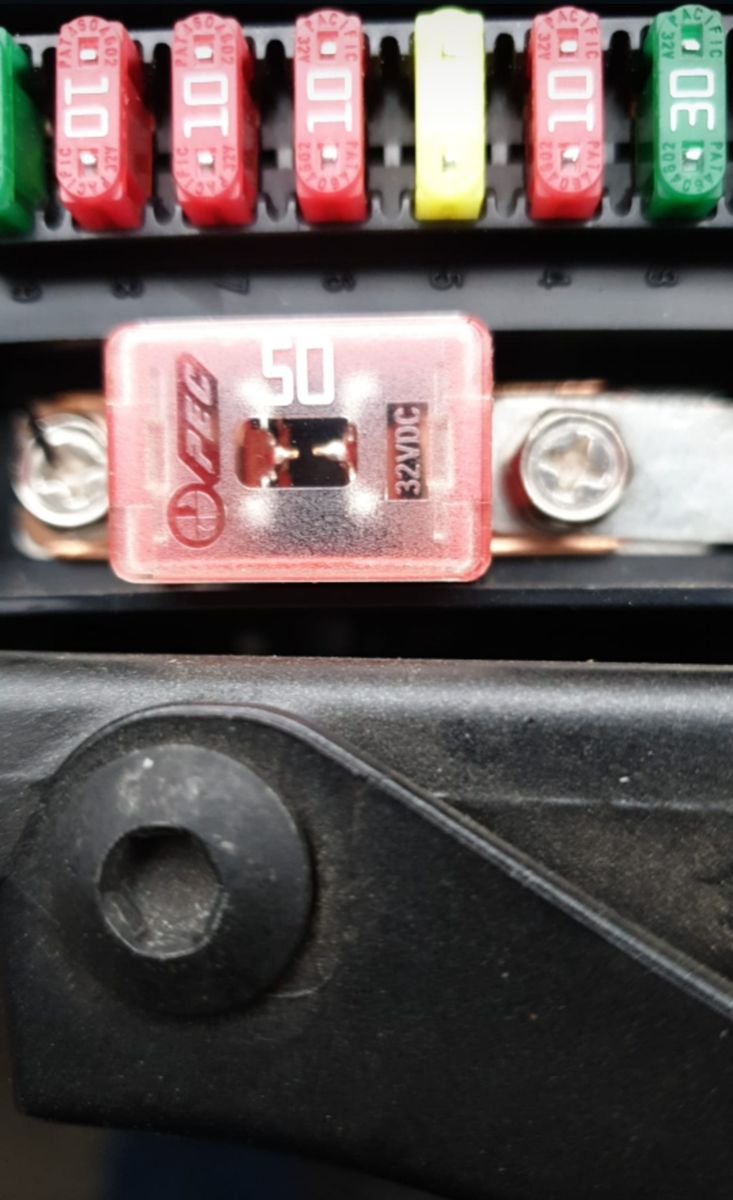 #28 Alles anzeigenSicherungen dieser Art sind häufig, z. B. "2 Stück SeKi Midi Schraubsicherung Hochstromsicherung 50A Ampere bis 32V DC - KFZ Auto LKW Streifensicherung" auf Amazon https://www.amazon.de/dp/B0BB7…GEXBTF31WC&language=en_US