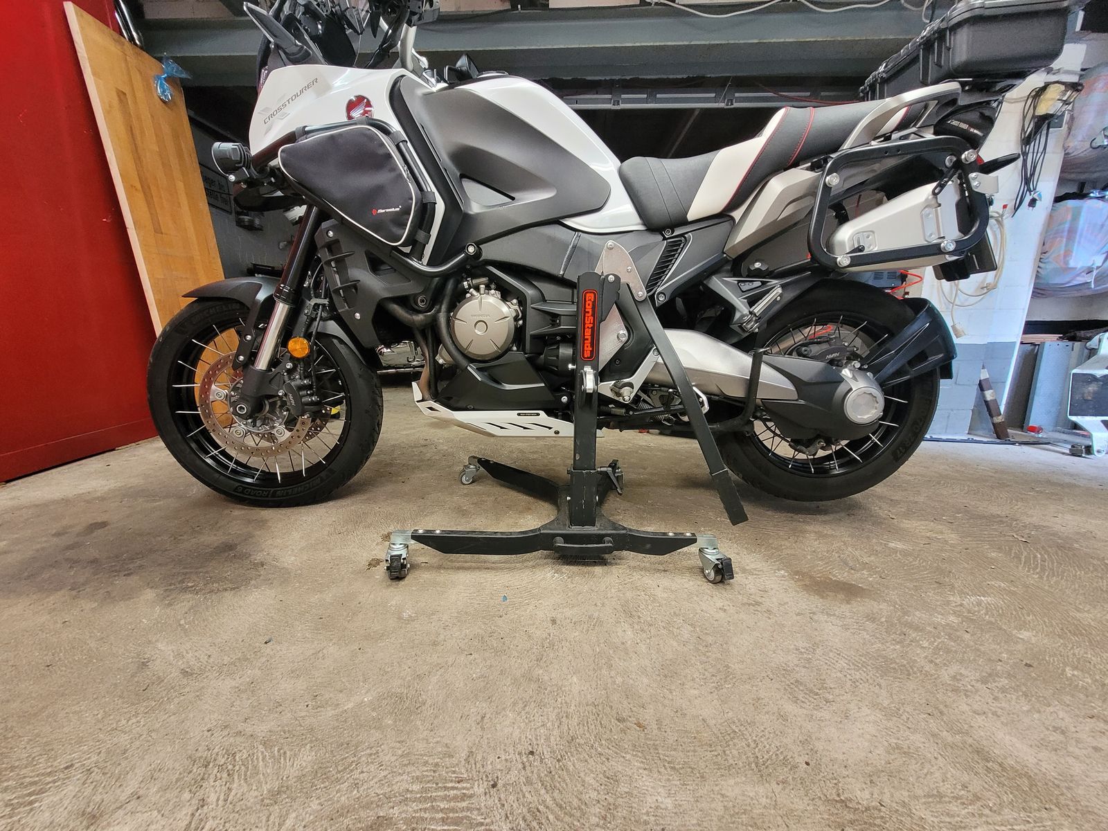 für meine SC76 habe ich mir einen gebrauchten Zentralständer gekauft. Leider schafft es dieser Ständer nicht bei vollem Hub das Vorderrad vollständig in die Luft zu heben. Wenn ich das Bike anhebe, ist zu erkennen, dass der Ständer Richtung Vorderrad kippt.