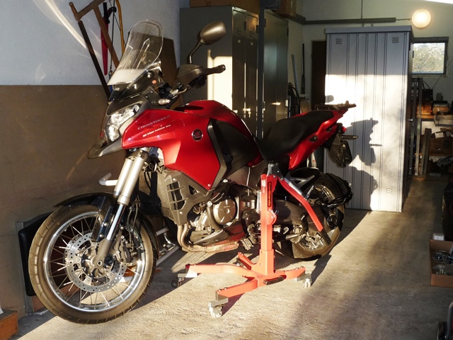 für meine SC76 habe ich mir einen gebrauchten Zentralständer gekauft. Leider schafft es dieser Ständer nicht bei vollem Hub das Vorderrad vollständig in die Luft zu heben. Wenn ich das Bike anhebe, ist zu erkennen, dass der Ständer Richtung Vorderrad kippt.
