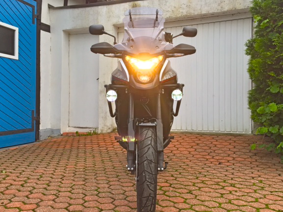 Gekauft habe ich mir die auch von ManfredK verwendeten/empfohlenen "LED-Devil Eyes" in Verbindung mit den SW-Motech Halterungen für die Hawk-Neblis. Hierzu mussten die Löcher an den Bügeln der Scheinwerfer etwas größer gebohrt werden. Das Kabelmaterial von den Scheinwerfern habe ich komplett übernommen.