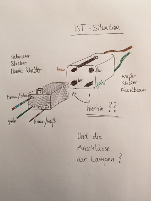 Dass ich einfaches "Plug & Play" mit dem ORIGINALEN HONDA Kabelbaum und dem ORIGINALEN HONDA Nebelschalter vergessen konnte, fand ich dabei aber schon ganz schön "schade". Auf dem Bild sieht man die vorgefundene IST-Situation...