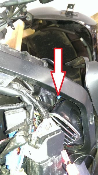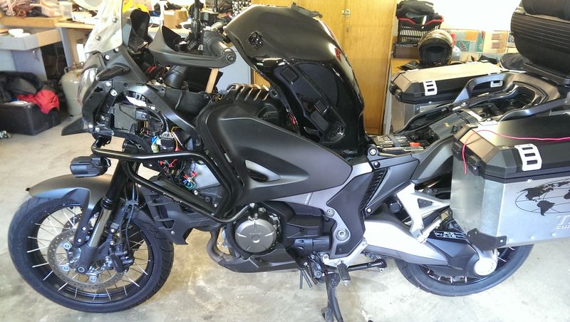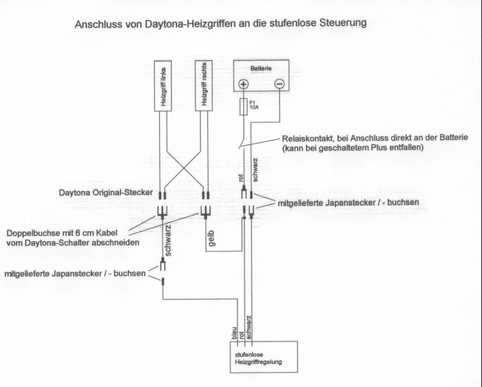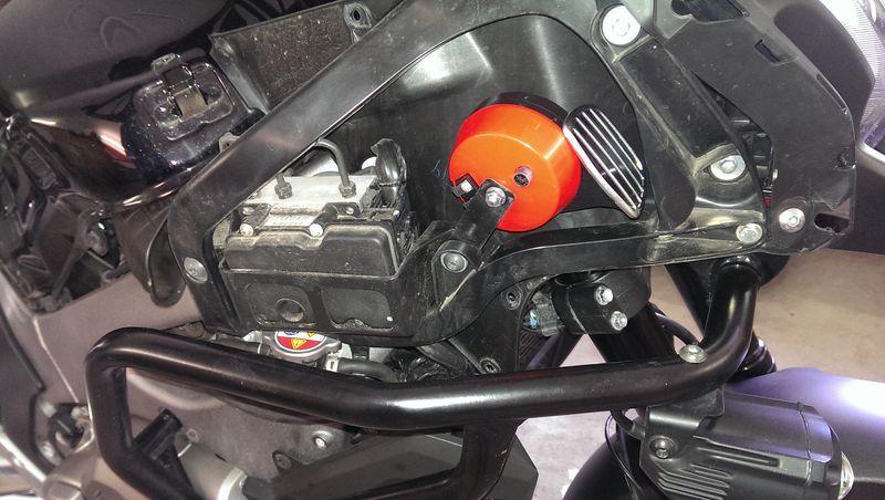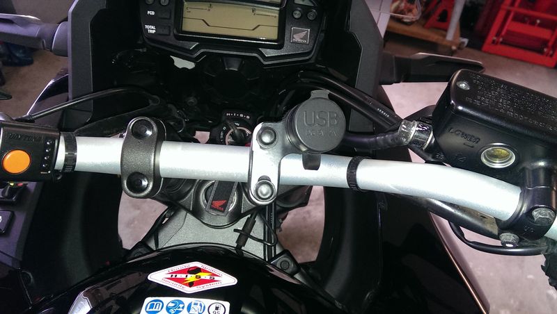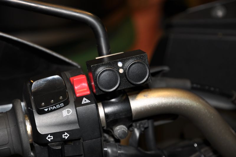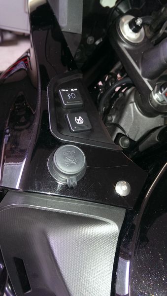 Der Vorbesitzer hatte vorn links in der Verkleidung so eine 12V-Ministeckdose verbaut, da das Loch bereits gemacht war, weitete ich es auf und hab dort ne gescheite Dose eingesetzt. Diese vorhandene komische USB-Dose kommt weg, das sieht grauselig aus, ebenso die hässliche Heizgriffsteuerung. Da baut mir mein Elektronikfuzzie was hübsches Gescheites, war schon an der Teneré und der Pan European. Die Tasten sind dann farbig, wie am Wasserhahn. Das Teil ist sein Eigenbau und funzt so: