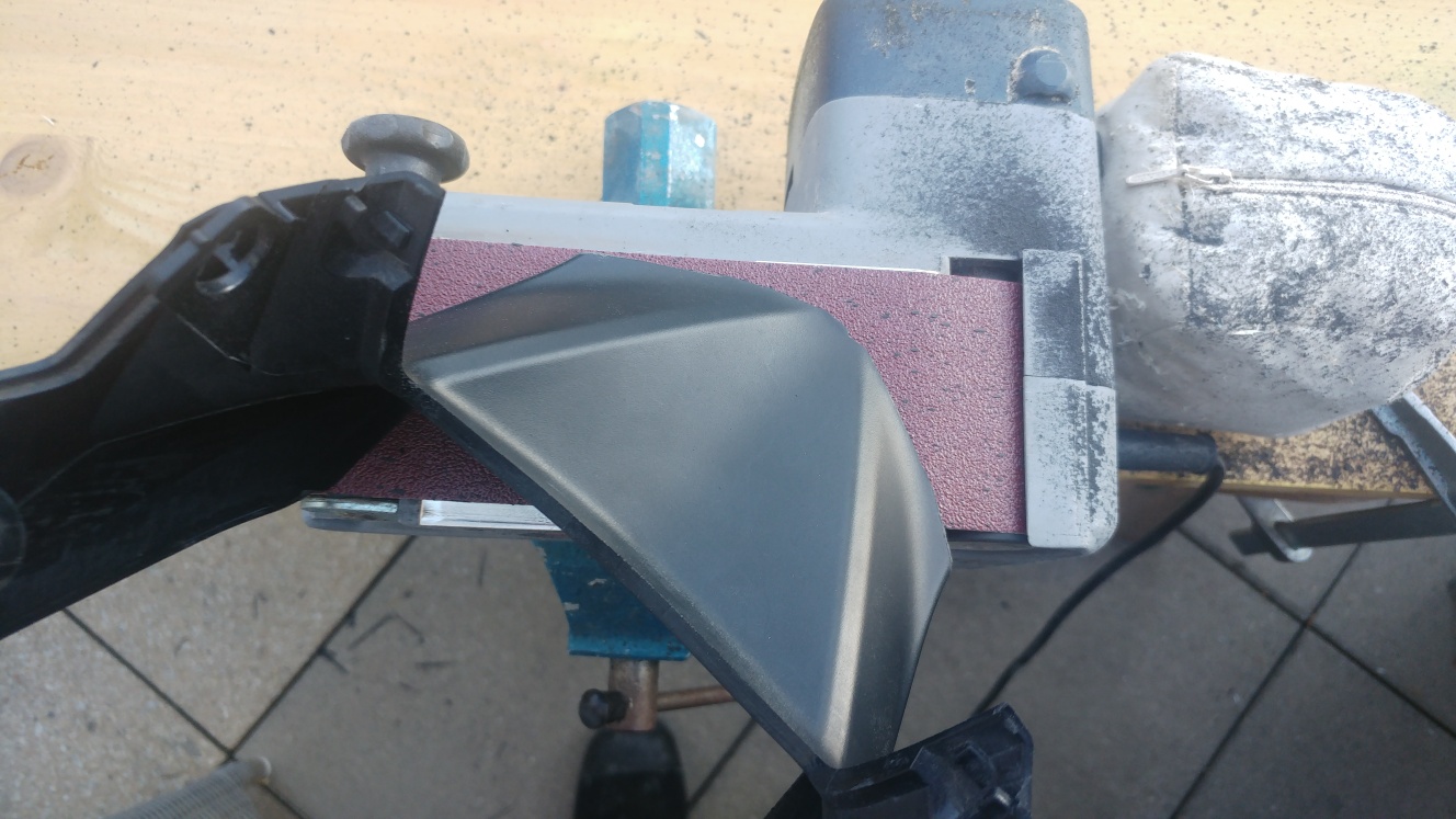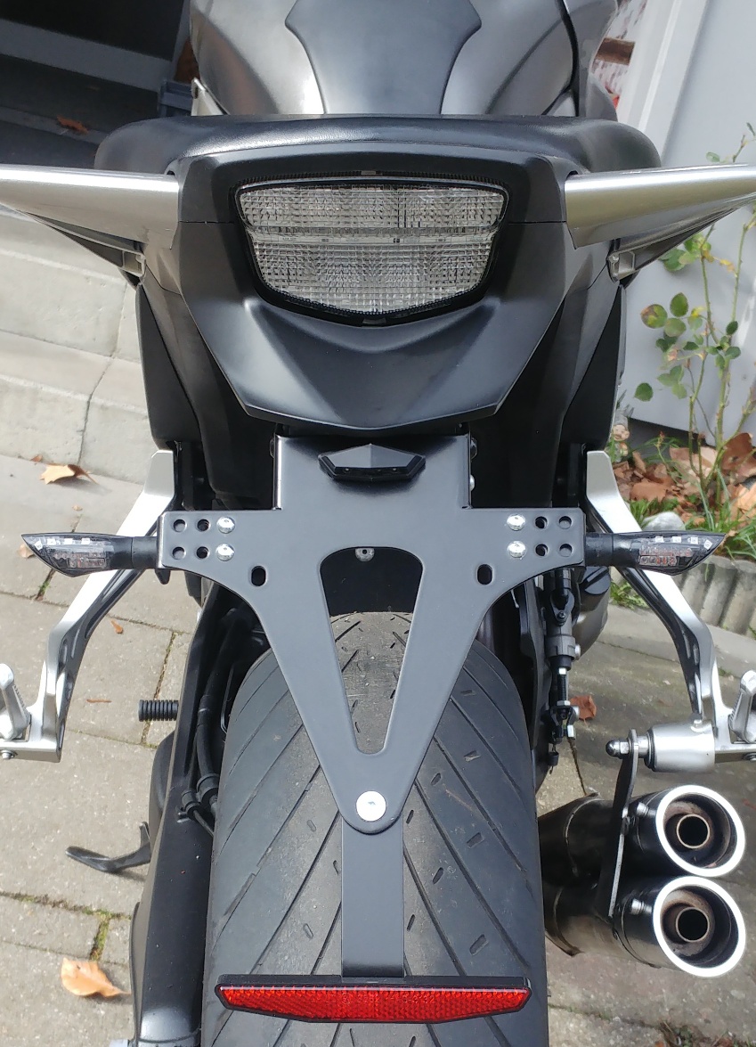 Zuerst ging ich mit meinem Bosch Multifunktionswerkzeug an das Polyamid 6.6 Hinterteil ran und amputierte das europäische Quatschteil am Ende. Dananch habe ich die Schnittkante mit einem Bandschleifer plan geschliffen um eine schwarze 4mm starke Polyamidplatte anzukleben (Industriekleber für PA). Das ganze dann noch formschön mit dem Bandschleifer bündig bearbeiten und um den universellen Kennzeichenhalter von RoMatech unten anschrauben zu können, mit drei M6 Einziehmuttern versehen. Ein 20mm Loch in der Mitte dient dann zur Kabeldurchführung für Blinker und LED Kennzeichenleuchte (von ToXx Motorsport).