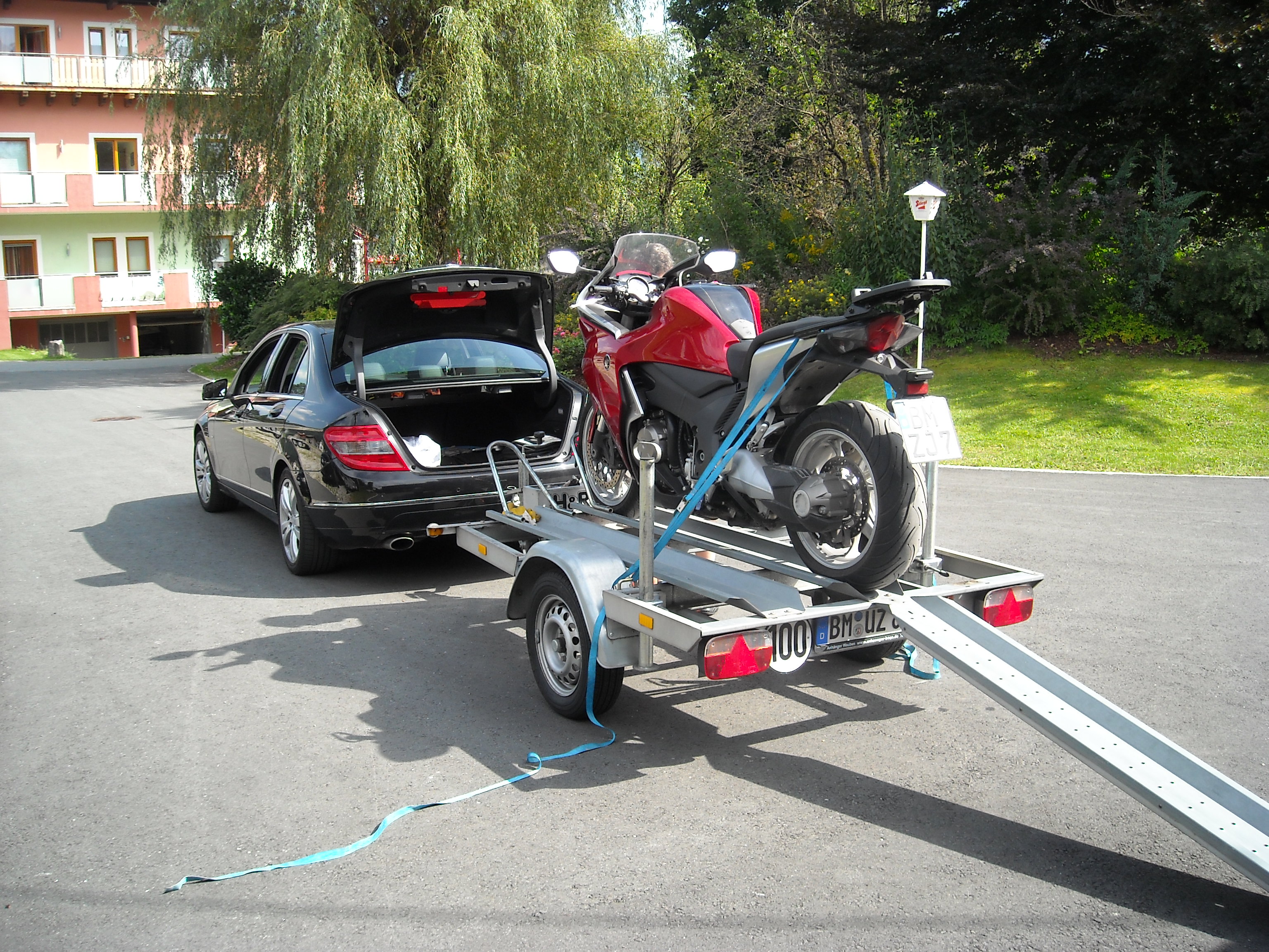 Am Besten den Anhänger leicht abschüssig plazieren, dann hast du leichtes Spiel. Auffahrrampe plazieren, Moped entsprechend ausrichten und mit leichtem Schwung zu Zweit, deine Frau am Besten hinten, nur schieben und Balance halten, und wenn möglich in einem Schwung drauf.