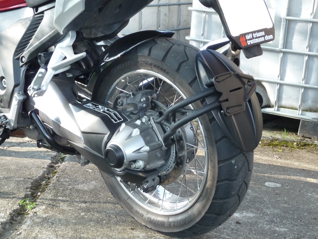 Das oben gemachte Angebot umfasst nur den Adapter (Bild (1+) 2) zur Befestigung eines Spritzschutzes am CT-Kardangegäuse (z.B.: abgespeckter Kennzeichenhalter inkl. Spritzschutz vom Ducati Diavel, oder der Kennzeichenhalter inkl. Carboncover von RIZOMA für Ducati Diavel (und weitere Ducs). Zur Befestigung können die am Kardangehäuse vorhandenen originalen Schrauben (8/30) verwendet werden. 2 Innensechskant Inox-Schrauben (8/16) für die Befestigung des Spritzschutzes am Adapter sind im Angebot enthalten. Dringend empfohlen wird die zusätzliche Verwendung einer flüssigen, mittelfesten Schraubensicherung wie z.B. "Loctite". Bei der Kardangehäuseschraube ist das auch Honda-Vorschrift (s. Werkstatthandbuch).