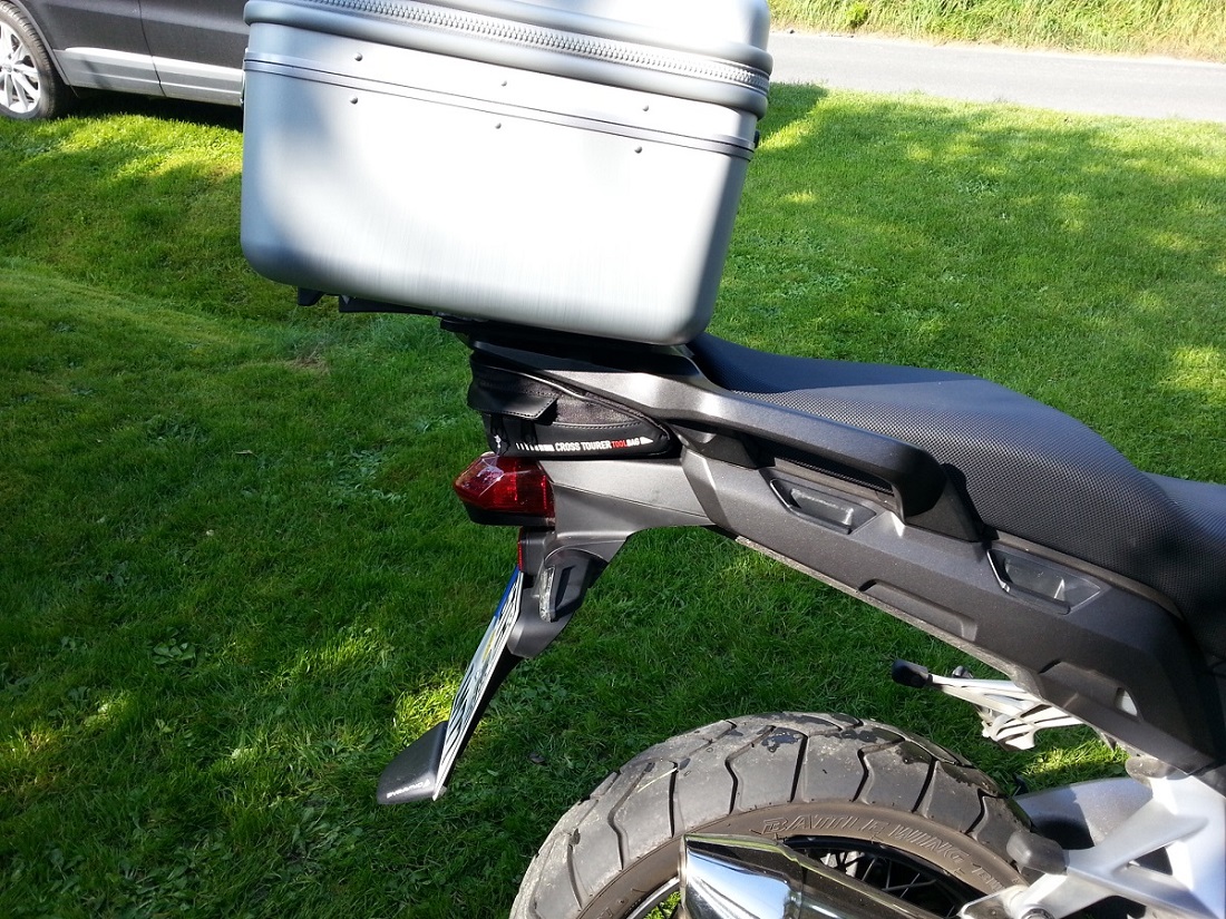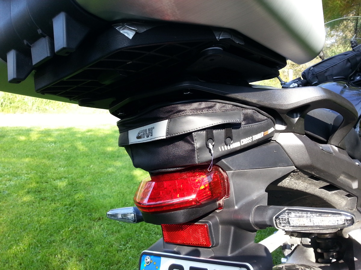 Das Anbringen war fummelig. Grundplatte vom Topcase runter, dann noch die Halteplatte, sonst kann man den kleinen Klett-Halteriemen nicht befestigen.