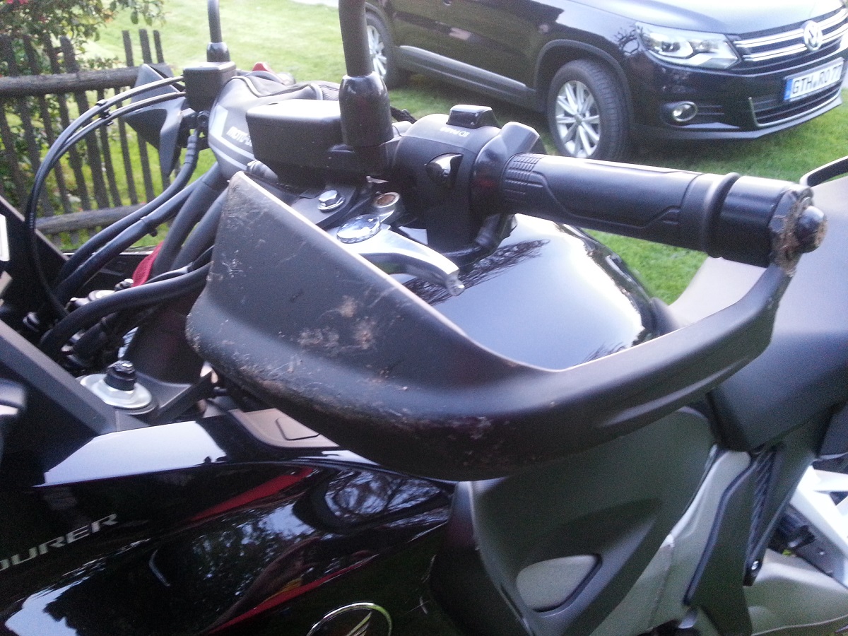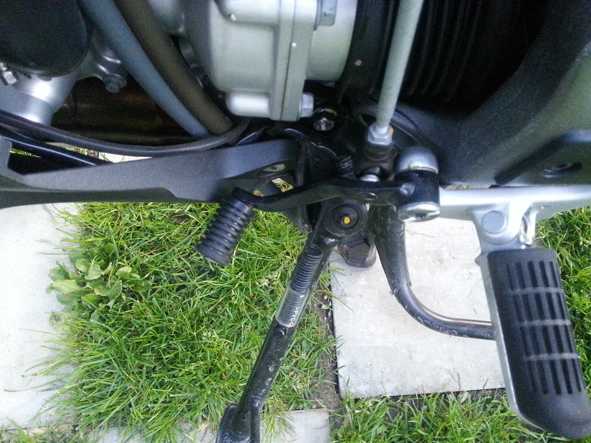 Da war dann mein "talwärts" stehendes Bein zu kurz, CT kippt, ich konnte den Brocken nicht mehr halten, ich irgendwie nach halblinks weg und da lag er. Zack Motor aus. Vorher hörte ich noch was abbrechen. Das war der Kupplungshebel, der jetzt eine ziemlich sportliche Länge hat. Spiegel ist zur Seite weggeklappt. Den Rest seht Ihr - bis auf die kleinen Kratzer am Getriebedeckel - auf den Bildern.