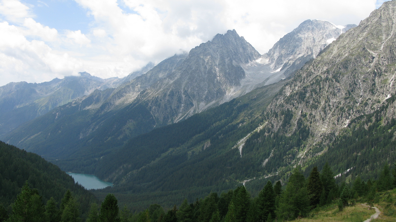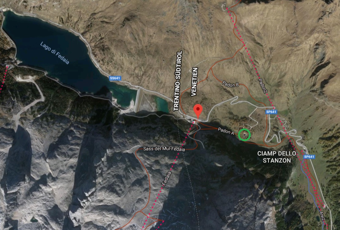 Geschenkt - Lago di Fedaia. Im grünen Kreis befindet sich eine Pizzeria mit einem ziemlich tollen Blick ins Tal - und guter Pizza.